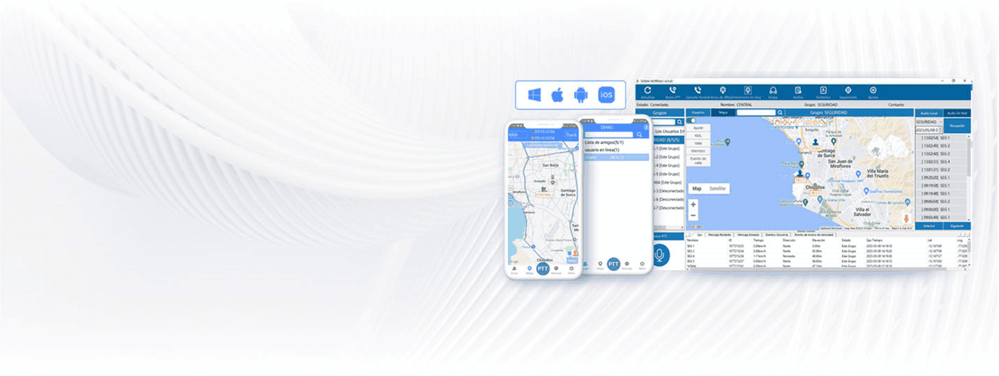 Galaxy PTT permite llamadas individuales, grupales y de difusión, mensajes cortos, seguimiento GPS en tiempo real, alertas por geocerca, grabación de voz, y funciones clave como SOS, trabajador solitario y patrullaje digital, todo desde una plataforma central y fácil de usar.